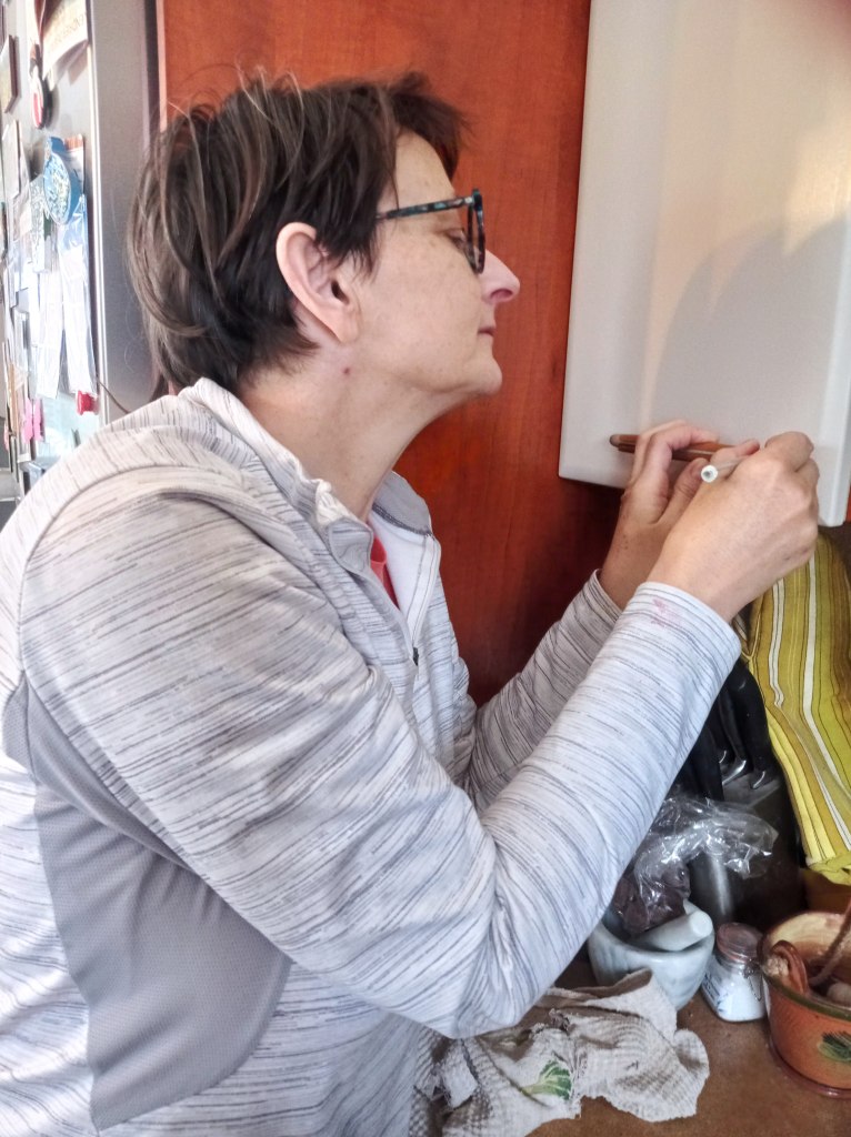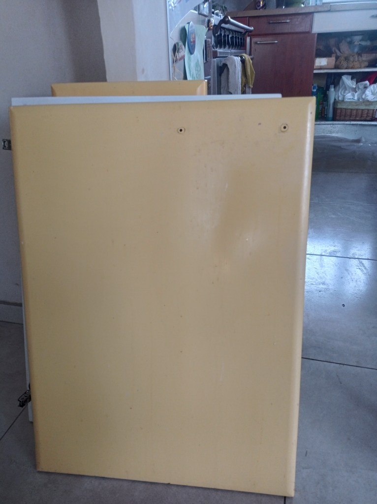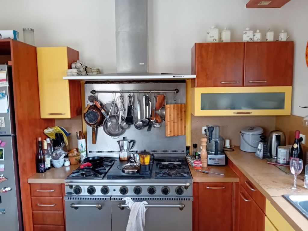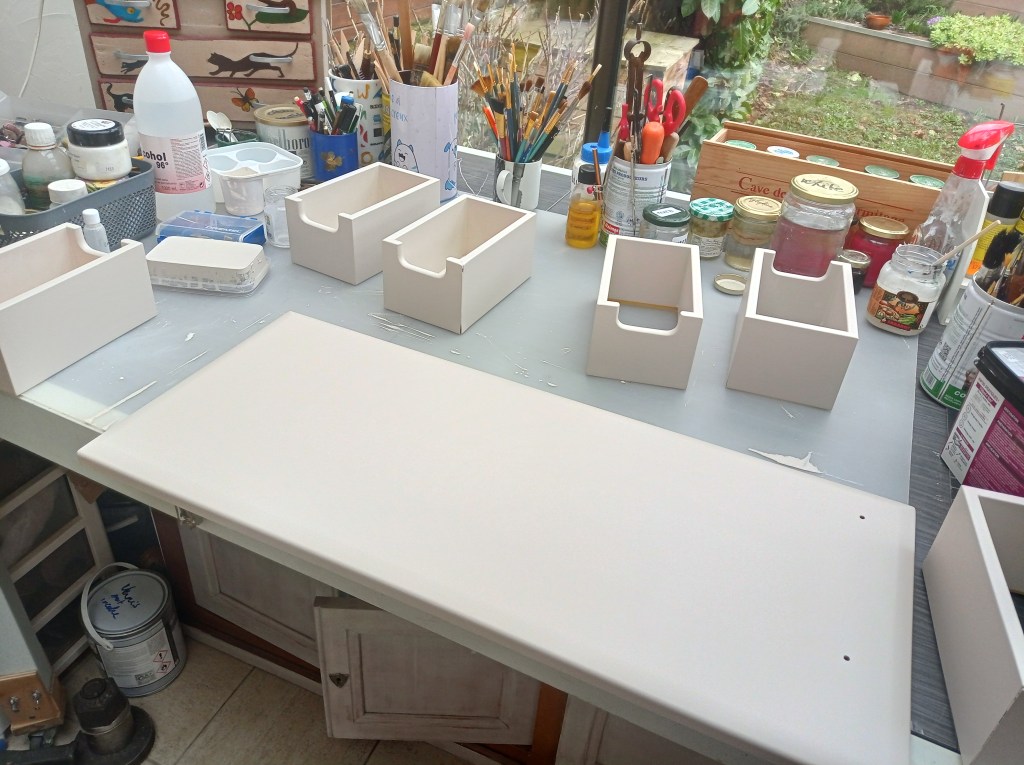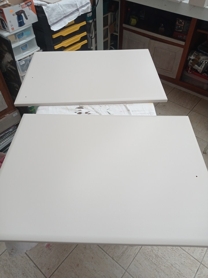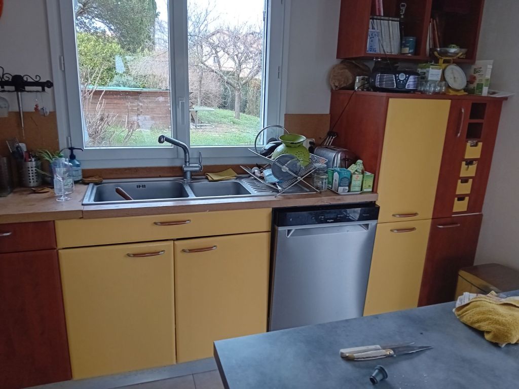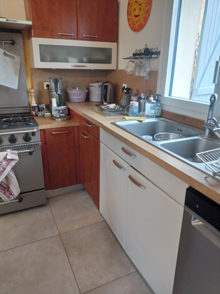 AvantAvant les portes sont en jauneAvant il y a un peu de crasseDébut de peinture sur place car la porte ne se démonte pas facilementmasquage des côtés à ne pas peindrepeinture des autres portes dans mon atelierpeinture de tous les tiroirspeinture des planchettesAprès : cuisine rafraîchieCela a contribué à la vente de la Maison